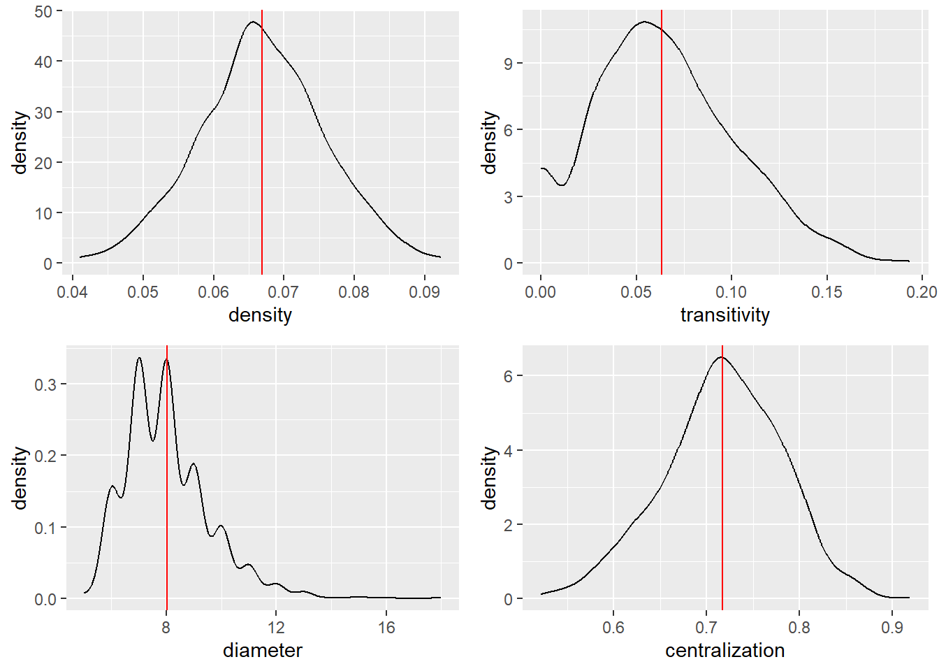 Using density plots in ggplot2, we can display the distributional features of the networks. First, I created the 4 graphs, then we can plot them side-by-side using the grid.arrange function.