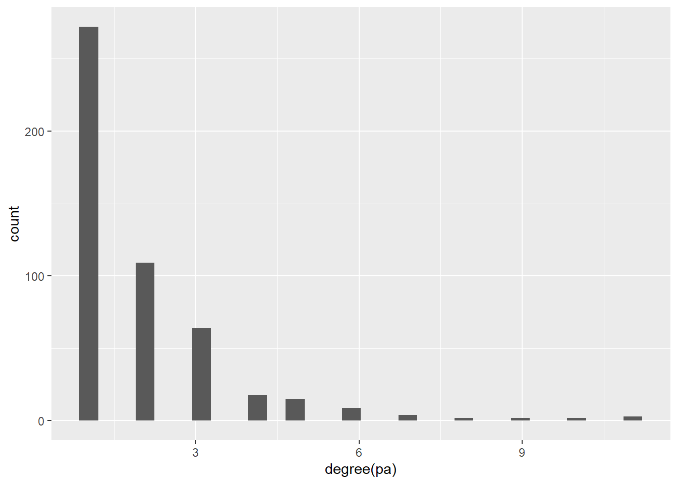 ggplot(deg, aes(x = `degree(pa)`)) +