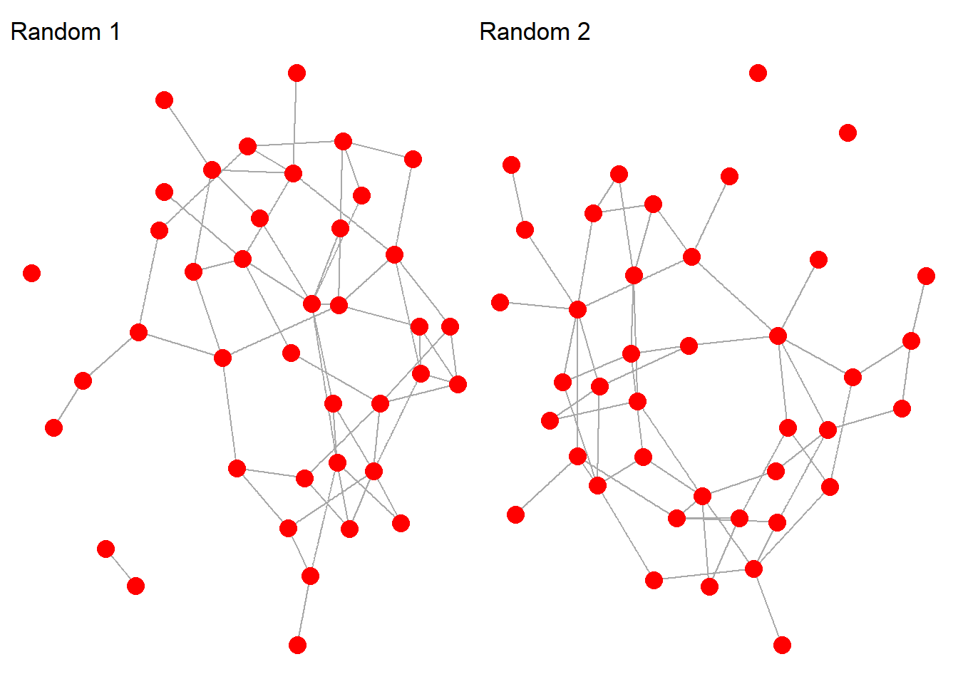 Even though the syntax for generating these two graphs is identical, the results show two different graphs. That’s because the random graph procedure is stochastic. In other words, the outcome depends on probability. We provide the general parameters for the graph, but the ultimate features of the graph maintain a random component.