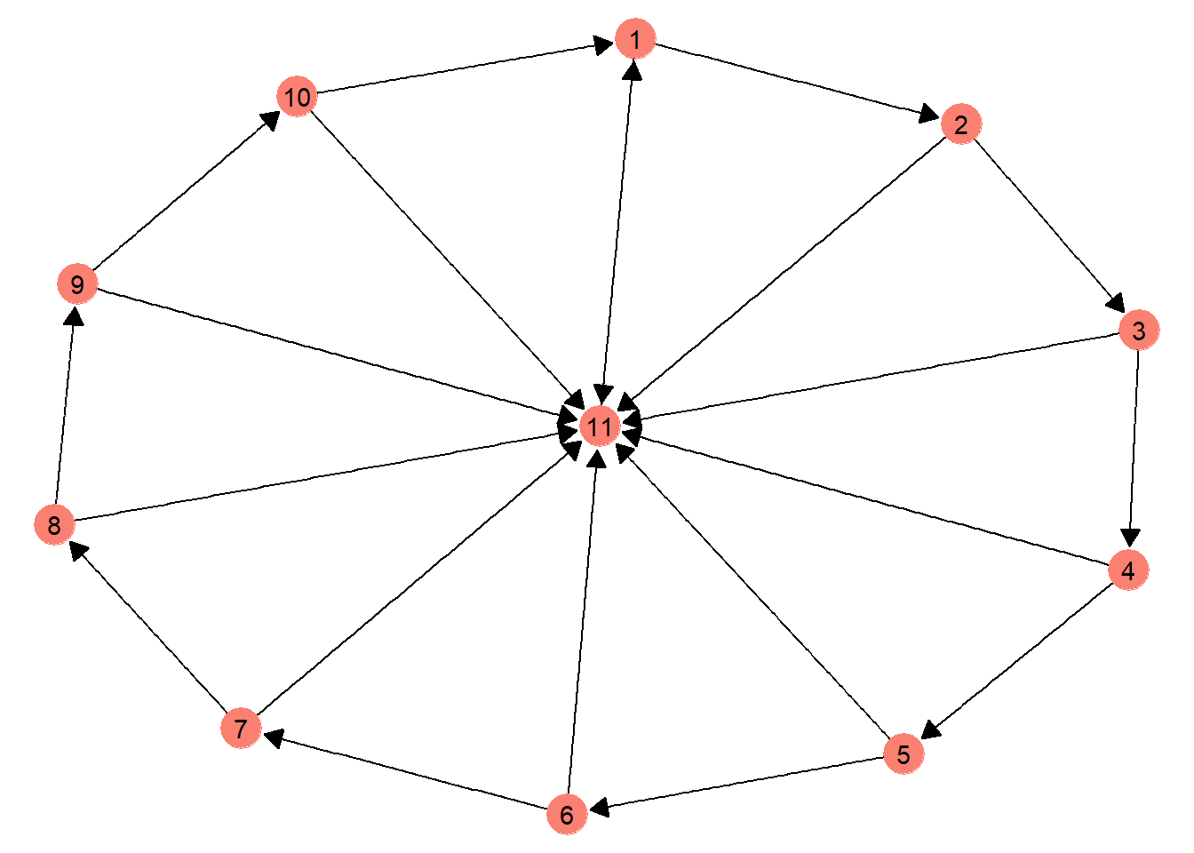 Nodes 1 and 11 receive that lion’s share of attention on the random walk. A close inspection of the graph object reveals why. All nodes have an option of choosing node 11 as a potential next path and once at node 11, the only path option is to travel to node 1.
