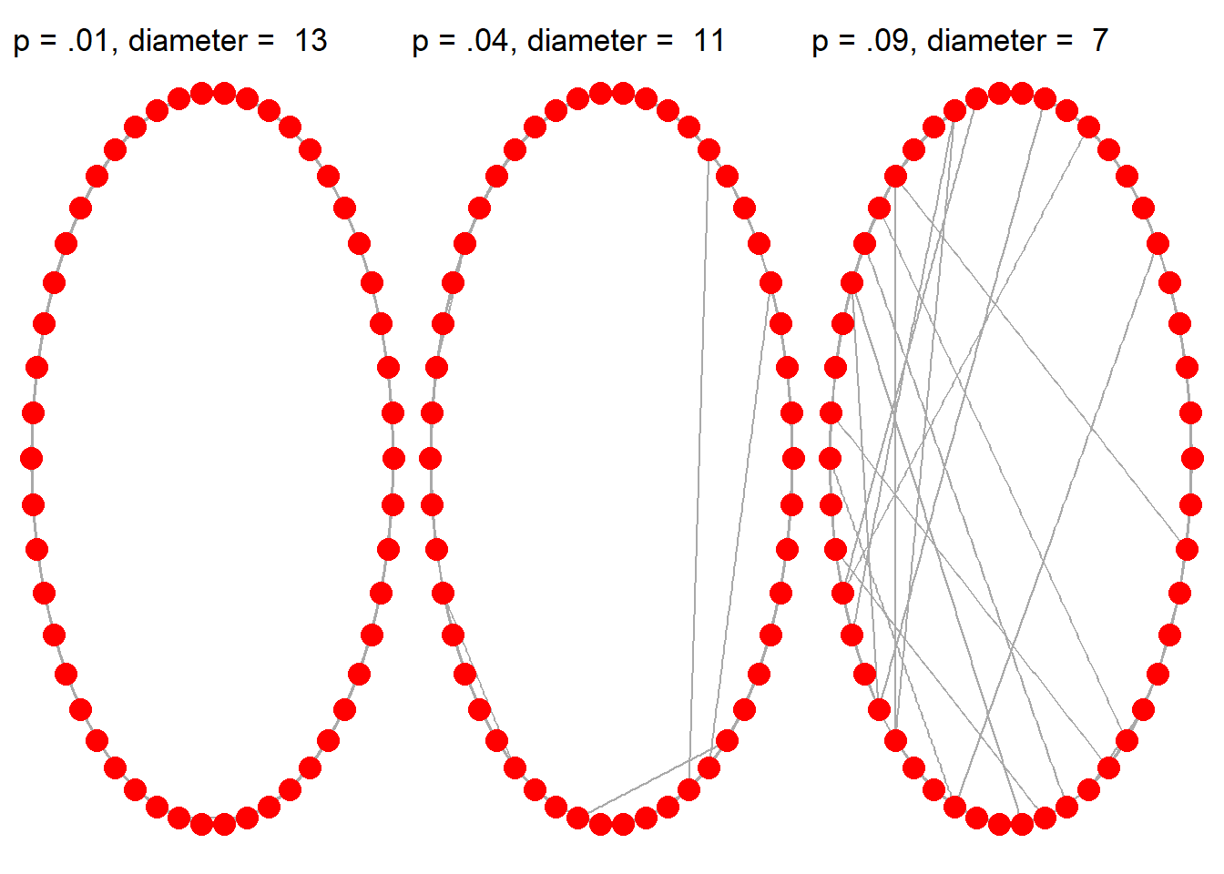 This theory is formalized and can be tested as part of the Watts-Strogatz game. The tendency toward local connectivity is captured by the “nei” option. Here we’ll set that as a constant equal to 2. P is the probability of connections outside of the local neighborhood (or in network parlance, “rewiring”). By varying the value of P, we can see how the world gets smaller. Specifically, we can focus on the diameter of the graph to see how large or small the world is. Larger diameters mean that the distance from one end of the graph to the other is greater.