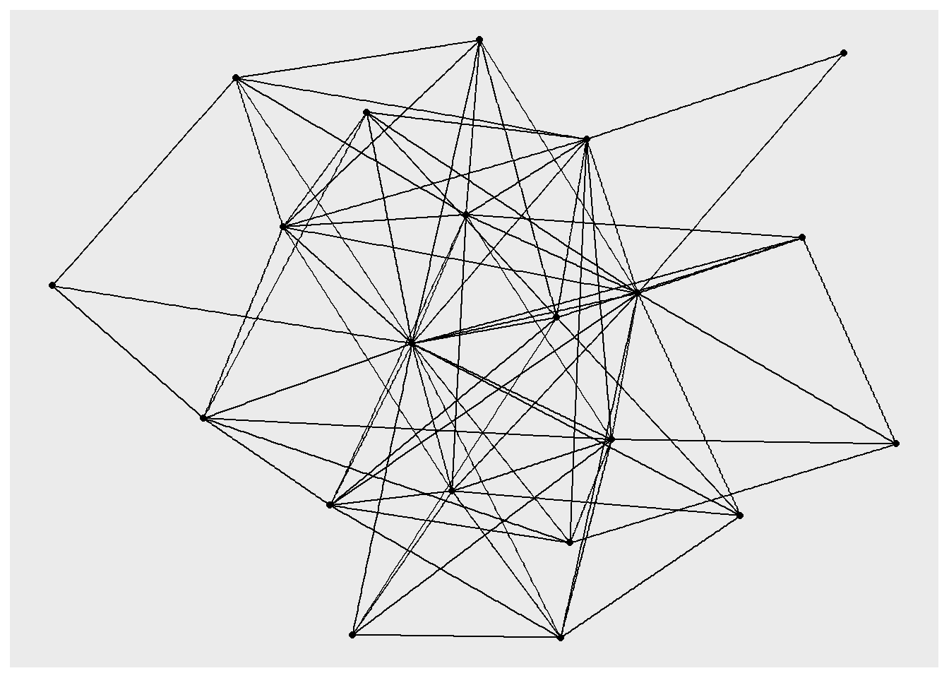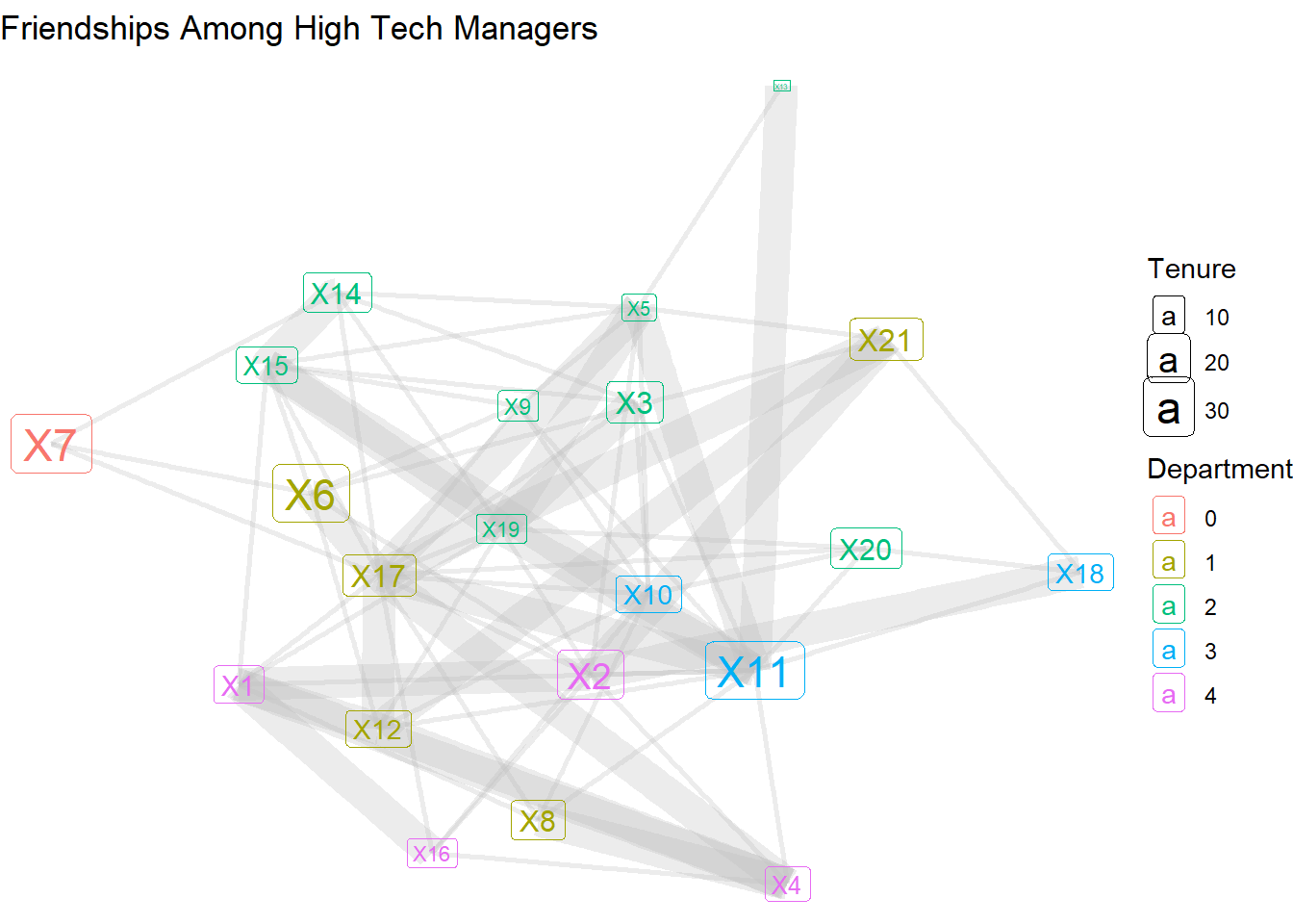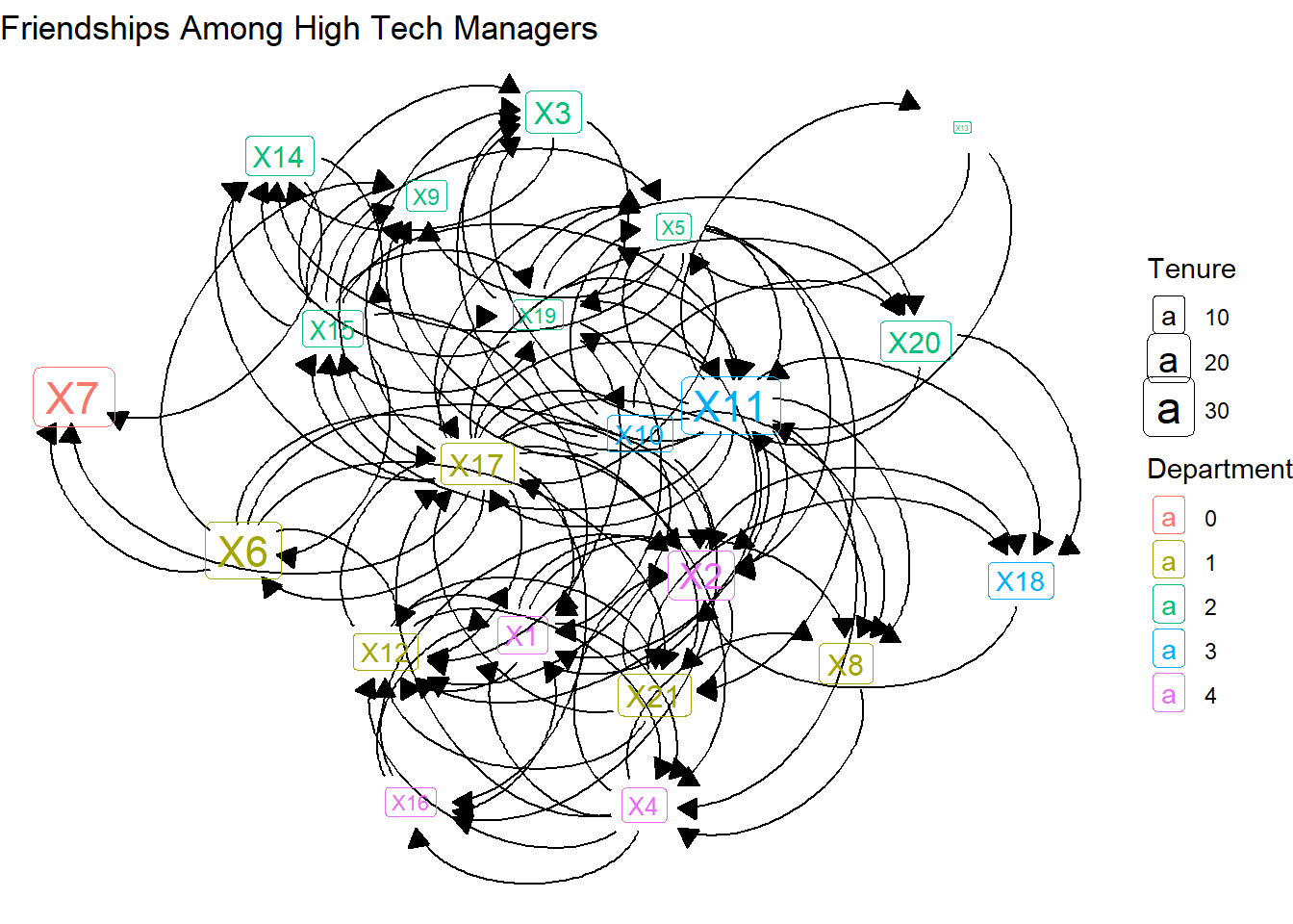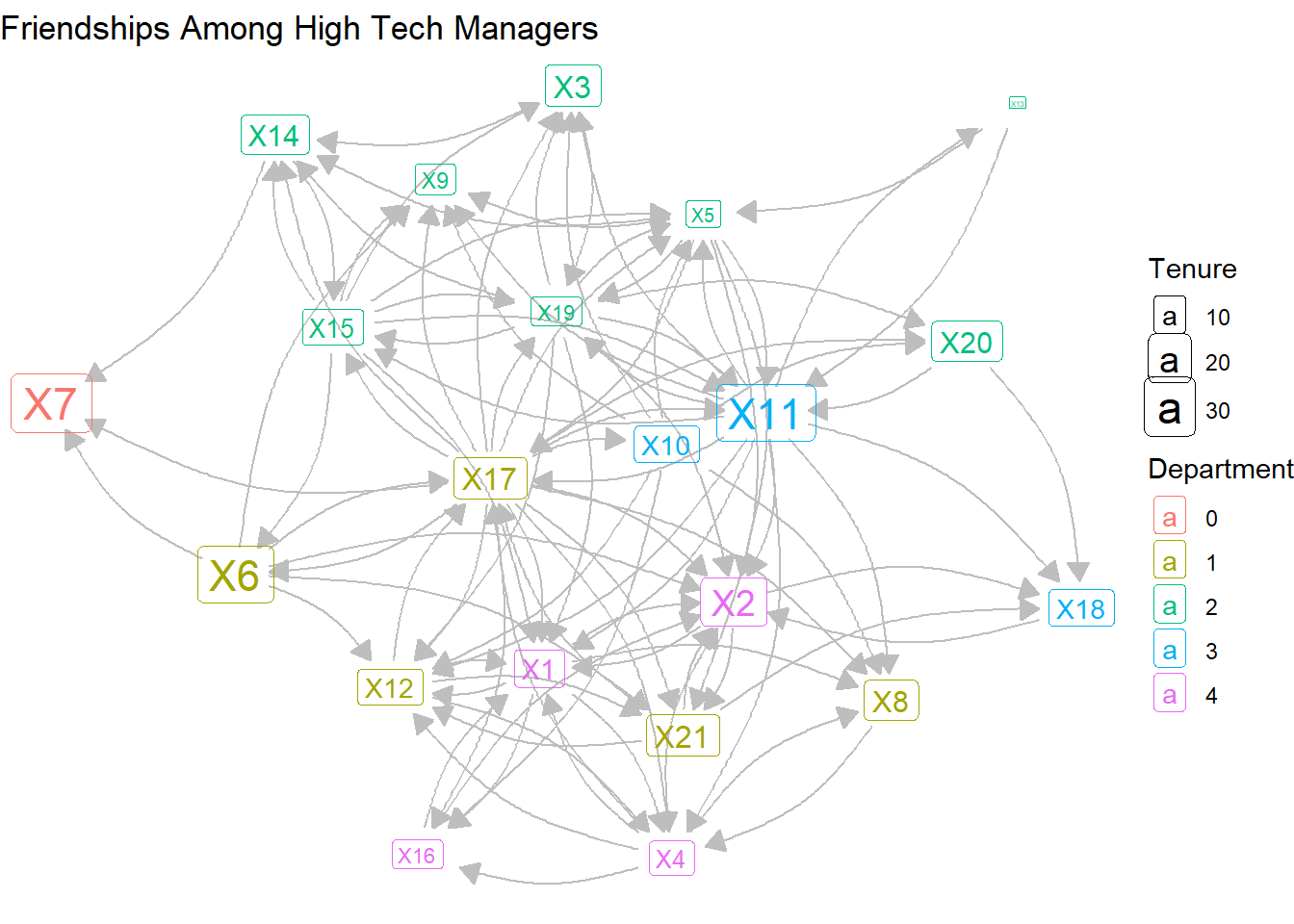 load_nets("hi_tech.rda")The network data files contain three different relations among 21 managers in this high tech firm: friendships, advice relations, and direct reporting relationships. We’ll work with the friendships, which were collected by asking each manager, “Who is your friend?”