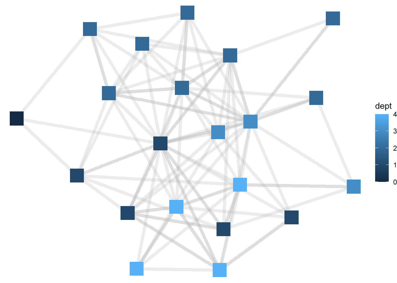 Now the node colors are colored from darker blue to lighter blue as the department for each manager gets larger. ggraph treats, by default, numeric variables such as department as continuous, but in this case it would be better to view departments as categorical (or distinct units). To do that, we will need to tell R to treat department as a factor variable.