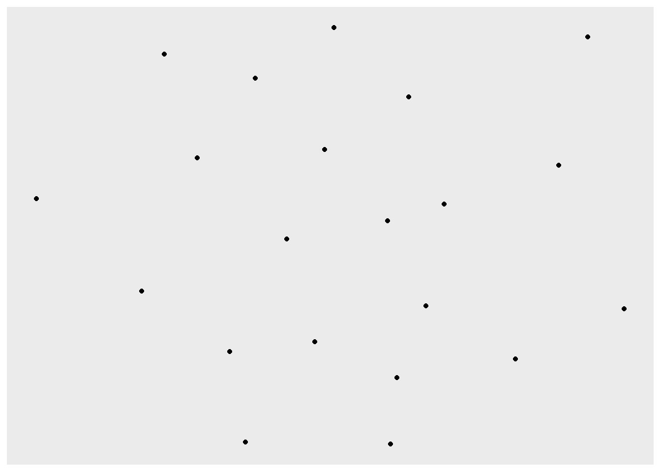One of the main benefits of the ggraph package (as well as the ggplot package from which it was derived) is that it allows one to build complex graphs by adding multiple simple layers. The first portion of the command identifies the network object to graph. Then each subsequent line adds an element to the graph. In the code below, we will start by placing the nodes only.