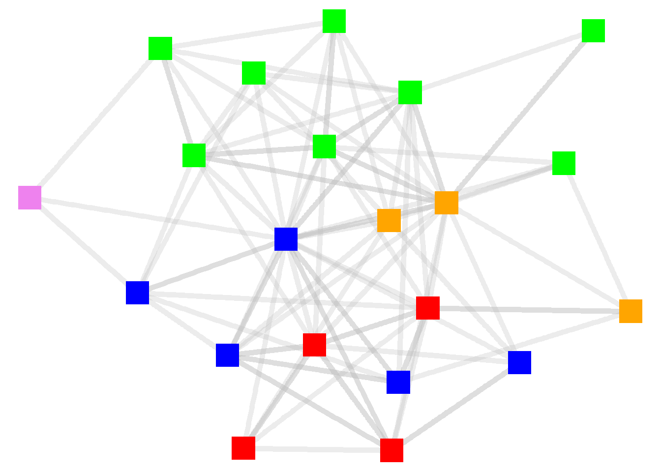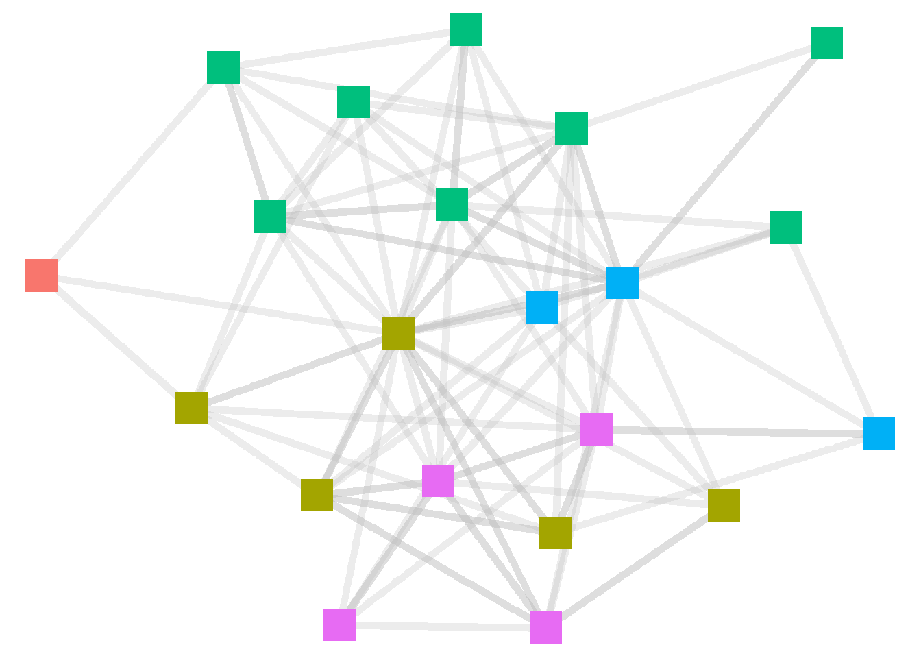 You can think about these kinds of changes as “global” adjustments to the graph because we are applying a single standard (such as “square”) to all of the elements (such as nodes) in a graph. In some instances, we might want to apply individual features of the nodes or edges to the visualization.
