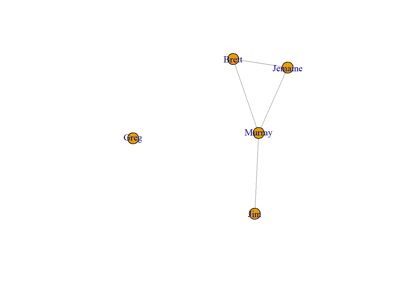 "Greg","Murray"), directed = TRUE)This network contains 9 ties. The total possible ties is n*(n-1), or 20. 9 divided by 20 is equal to 0.45. Let’s check our work.