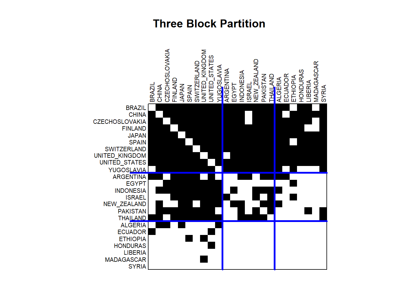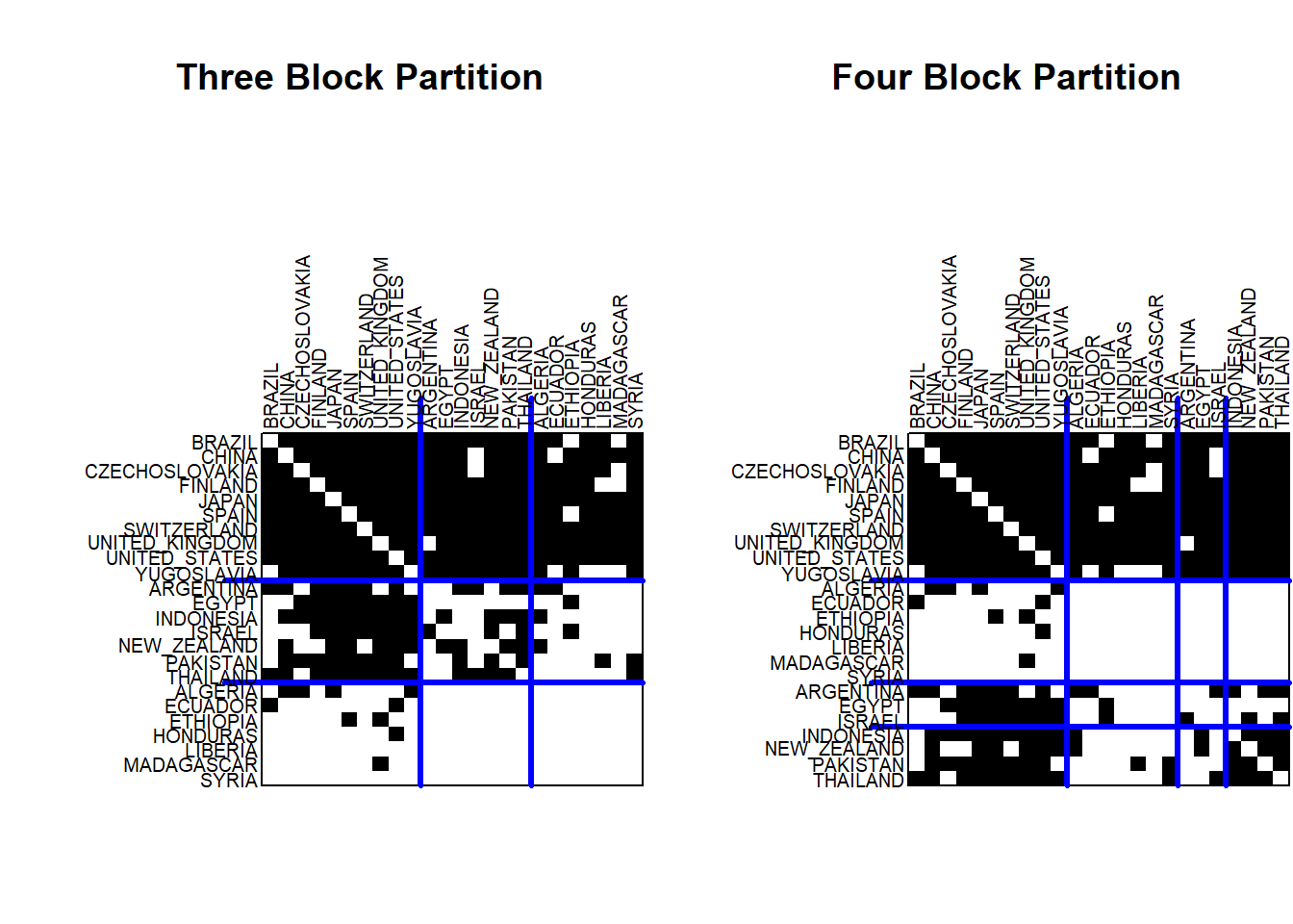 Let’s consider the patterns in the the three block group model. The center of the adjacency matrix shows the trade relations between the countries in the middle or second block group. The diagonal is understandably empty, but otherwise the block is nearly a complete graph. The exception is that Yugoslavia does not send manufactured goods to Brazil. Otherwise, all of these countries both send and receive manufactured goods from their fellow block members. To the right and to the left of the center partition, the results show that the second block group sends manufactured goods to many of the countries in the first block (Argentina to Thailand) and the third block (Algeria to Syria). Looking above the center partition, the results show that the second block group receives manufactured goods from many of the countries in the first block group. However, very few of the countries in the third block group send manufactured goods to the second block group. These patterns tell us something about the roles played by these countries. The second block represents the core in the world system. They send manufactured goods throughout the world. Block 3 represents periphery countries. They send manufactured goods to only a small number of countries in the core and otherwise receive manufactured goods from the core and a few other coutries. The first block represents the semi-periphery countries. They are heavily involved in trading manufactured goods with the core countries, with only a modest set of exports to periphery countries.
