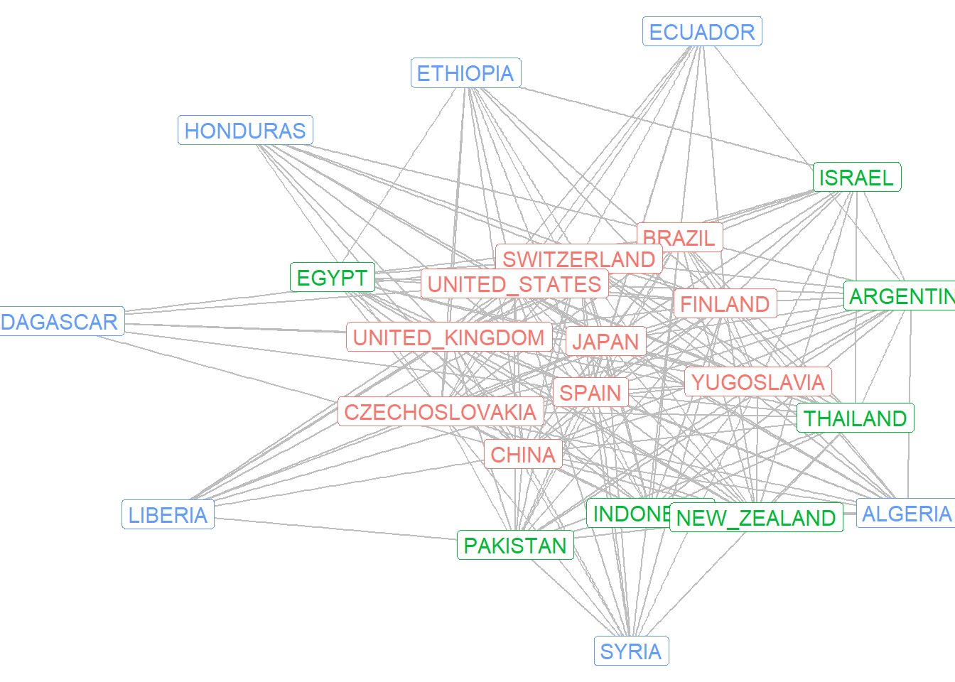 Here we can see the core countries in the green labeling, the semi-periphery countries in the red labeling, and the blue countries on the periphery. These results are largely consistent with Wallerstein’s theory of the world system.