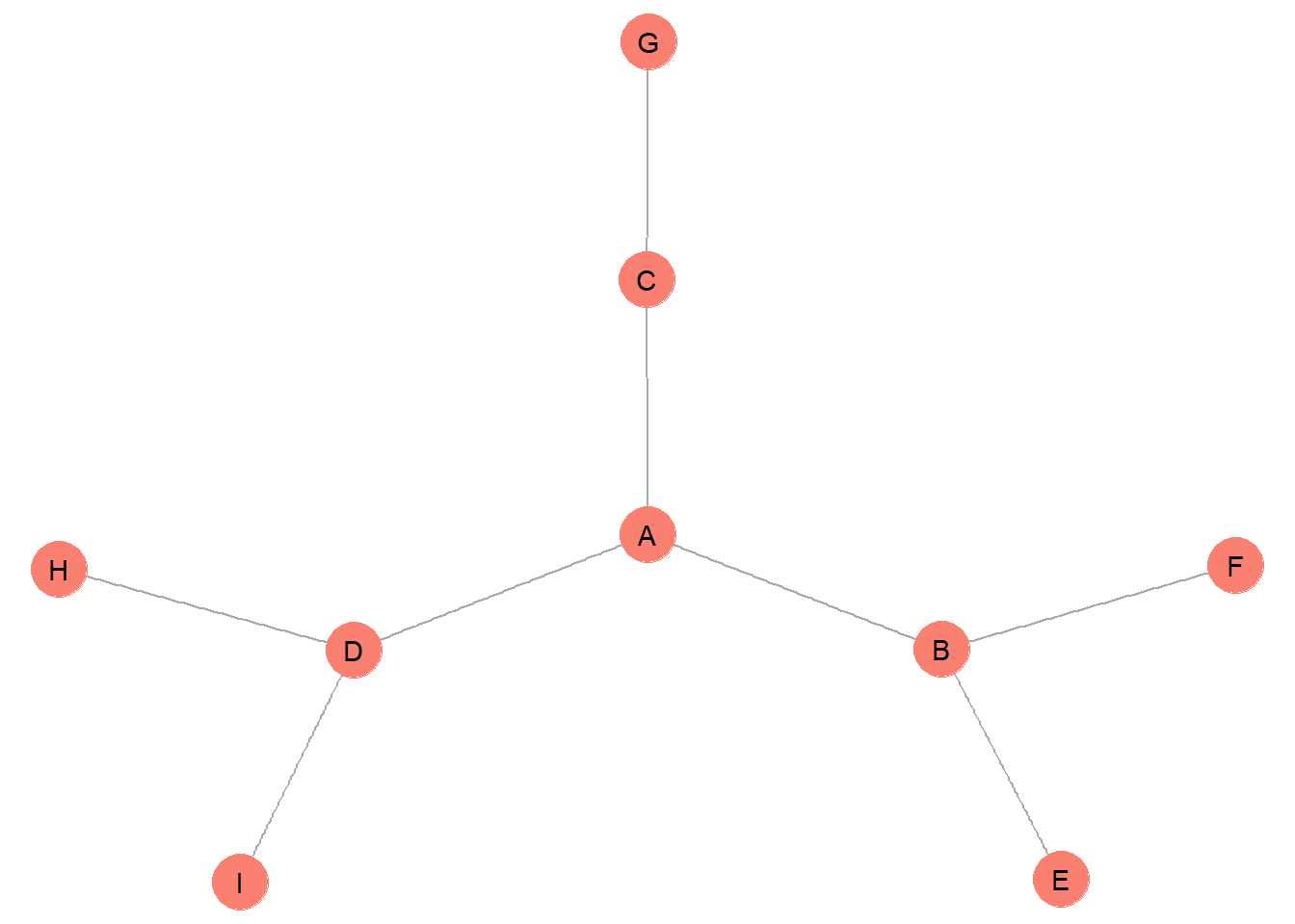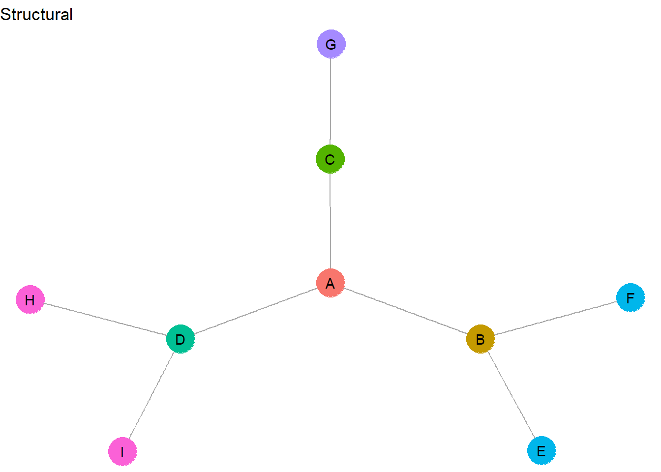 This graph contains very few nodes that are exactly structurally equivalent. In fact, <H,I> and <E,F> are the only identical role sets. H and I have all of the same network metrics and they are connected in the same way to the same node (D). E and F are also identical in network metrics and are connected in the same way to the exact same node (B). All of the other nodes are unique from one another and therefore make up their own unique role set.