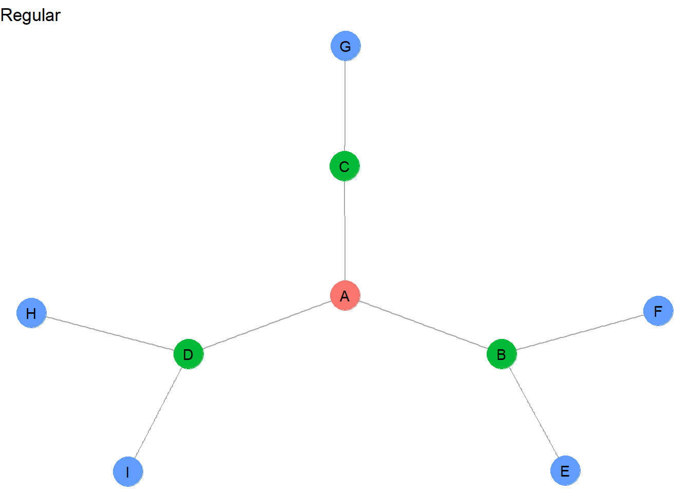 These regularly equivalent sets now group together all of the network “pendants”: <E,F,G,H,I>. And whereas C was not automorphically equivalent with B and D, it can be considered regularly equivalent because it appears to fulfill a similar mediating role between a peripheral actor and the central A node.