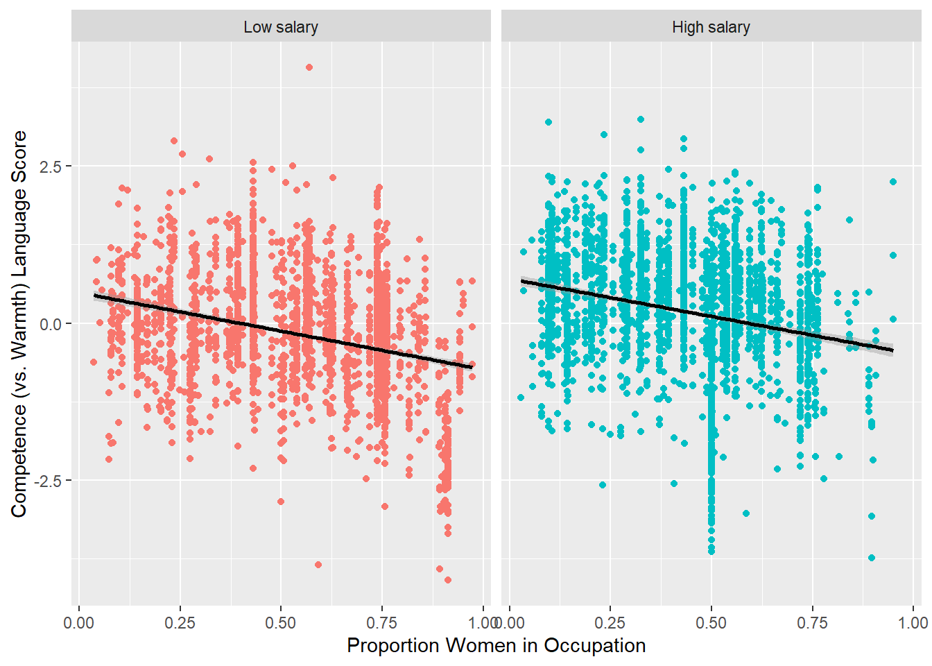 The graph shows a decline in competence language (and increase in warmth language) as proportion women in an occupation increases. The slope of this decline is similar for both low and high salary jobs. Since the process operates the same for both sets of jobs, this suggests that there is no significant statistical interaction between proportion women and salary. To be thorough, we can check this out below.