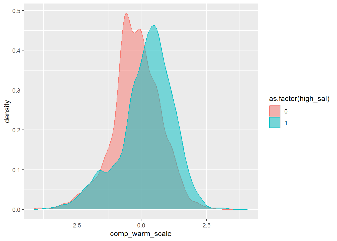 mutate(high_sal = if_else(sal_mean >= 90000, 1, 0))Now let’s visualize this relationship with a density plot showing the comp_warmth_scale distribution separately for low and high salary jobs.